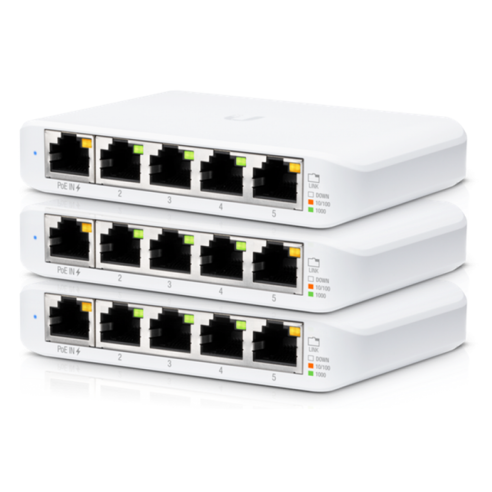Набор компактных свитчей Switch Flex Mini, входящих в серию коммутаторов UniFi. Модель прекрасно подойдет в случаях, когда есть необходимость подключить несколько периферийных устройств к сети UniFi по витой паре, а питание PoE не требуется.