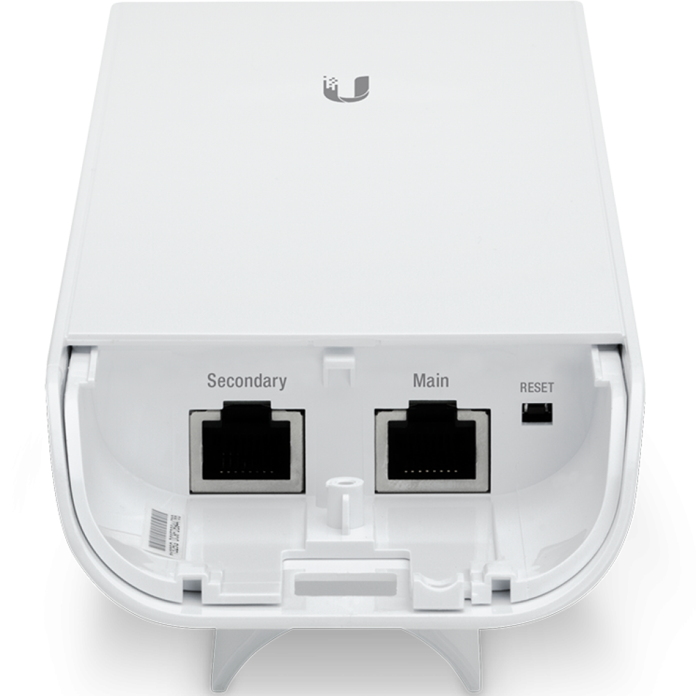 NanoStation M5 соединяется с сетью по двум портам Fast Ethernet. К главному порту подсоединяется клиентский терминал и подаётся питание в пассивном режиме PoE (адаптер на 24 В в комплекте). На вторичном порте с помощью программного обеспечения можно включить раздачу PoE и подключить и запитывать в сквозном режиме, например, камеру видеонаблюдения.